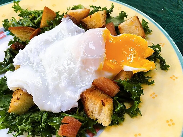 In our CSA farm share from Woven Roots Farm, one of our recent items was a beautiful head of frisée, which meant we would definitely have Salade Lyonnaise with our dinner. I love how the egg yolk enriches the dressed greens, and how the salty lardons (chunks of bacon) and crunchy croutons complement the flavors.